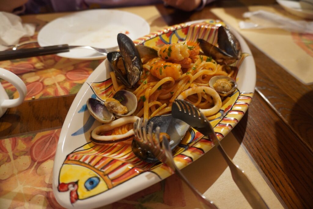 ペスカトーレは魚介がたっぷり入っていて、平たいもちもち食感のパスタと相性抜群。盛り付けられたお皿もかわいくて、視覚的にも楽しめました。
