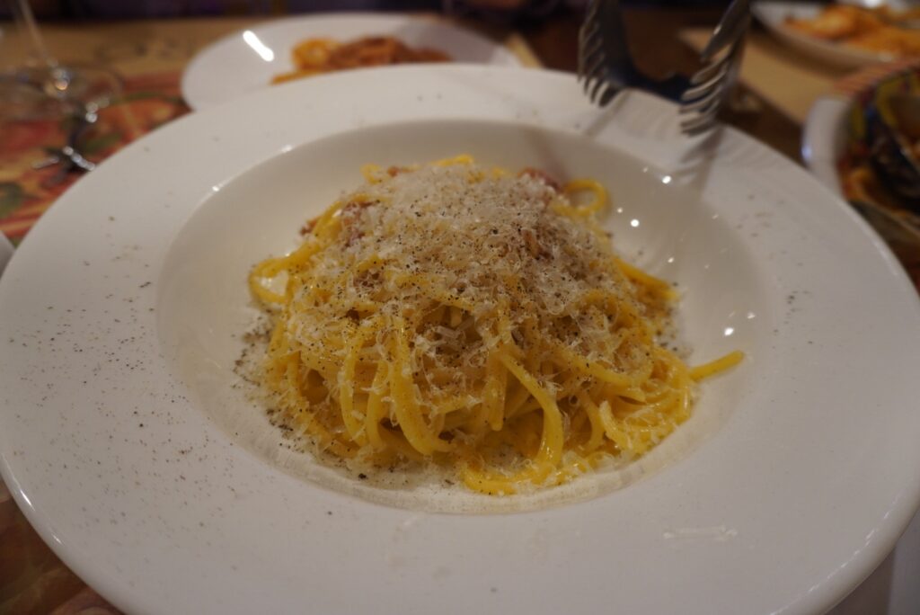 カルボナーラは濃厚なソースにもちもち麺が絡み、さらにチーズがかかっていて絶品。大人も大満足の味でした。