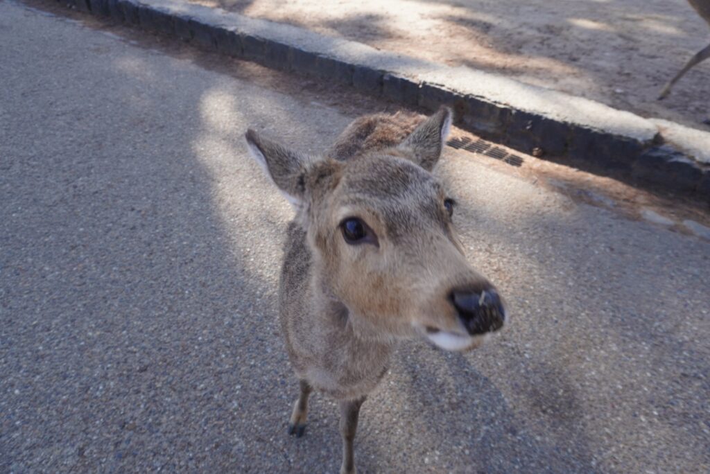 道中には鹿がたくさんいて、歩いているだけでも楽しい雰囲気です。この春の時期は、オス鹿が発情期みたいで、小さなお子さんは少し注意が必要です。基本的には鹿せんべいに向かって近寄りますが、「せんべい持ってる?」みたいなノリでとりあえず近寄ってくるので、もってないよって素振りを見せればOK!