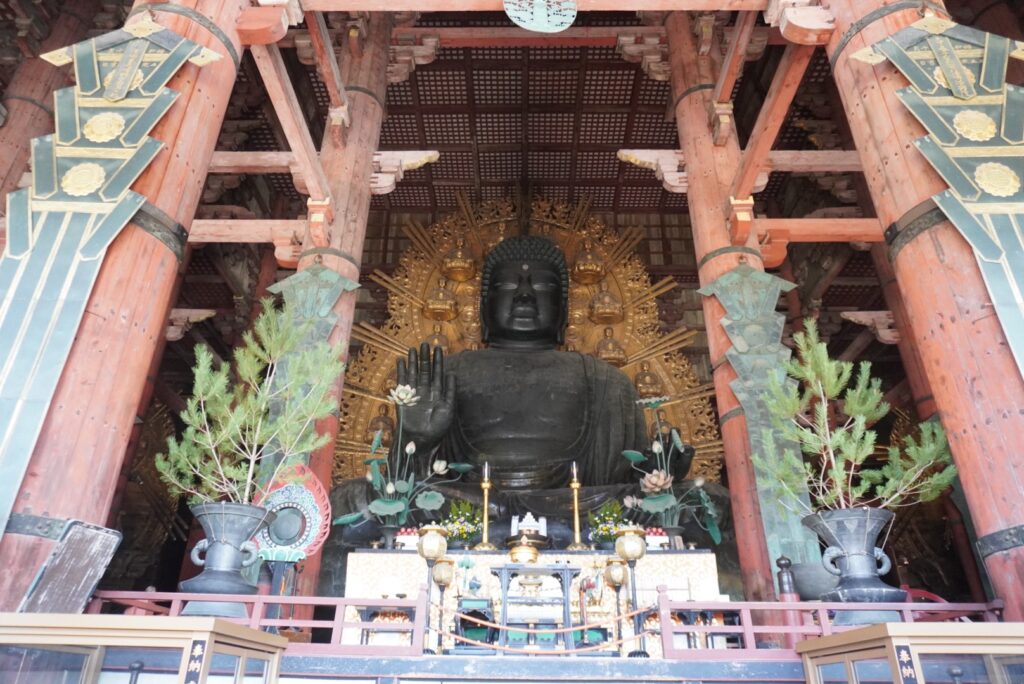 中へ入ると、すぐに国宝「廬舎那仏(大仏さん)」が目に飛び込んできます。高さ約15mもあり、娘はお腹のあたりを「壁」だと思っていたほど。