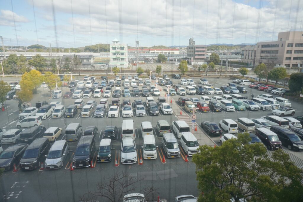 私の車はわりと大きめですが、それでも止めることができたので、たいていの車であれば大きさは気にすることないと思います。また、今回のように9時過ぎであれば、まだ割と空いていましたが、観光が終わって移動する頃(11時すぎごろ?)には駐車場が埋まってたので、お昼頃利用される方は注意が必要です。