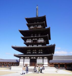 五重塔や金堂は国宝で、境内には国宝38件・150点が展示される仏教美術の宝庫。百済観音など、教科書で見た名品が勢ぞろいしています。