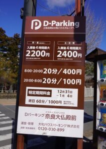 今回は「Dパーキング奈良大仏殿前」を利用しました。選んだ理由としては、料金も良心的であり、割と東大寺大仏殿に近いということだ。もし東大寺大仏殿へ行く用事がある場合は、こちらの駐車場を利用してみると良いと思います。