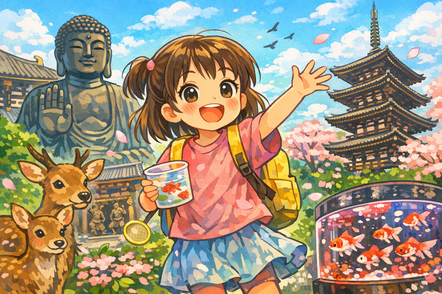 東大寺の大仏さんの大きさに驚いたり、金魚ミュージアムで遊んだり、鑑真や聖徳太子の話をしながら歩いたりと、歴史と遊びが自然に混ざり合う1日。