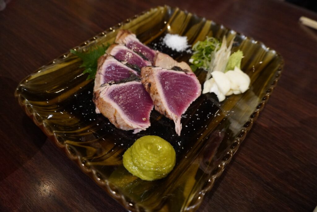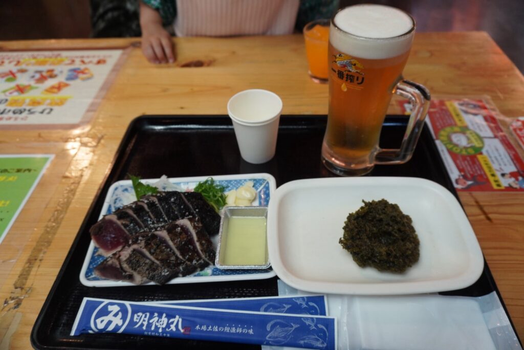 高知名物はもちろん、子どもが食べやすいメニューも多く、ここでもかつおのたたきを堪能した。美味しいお酒で一日目は終了。