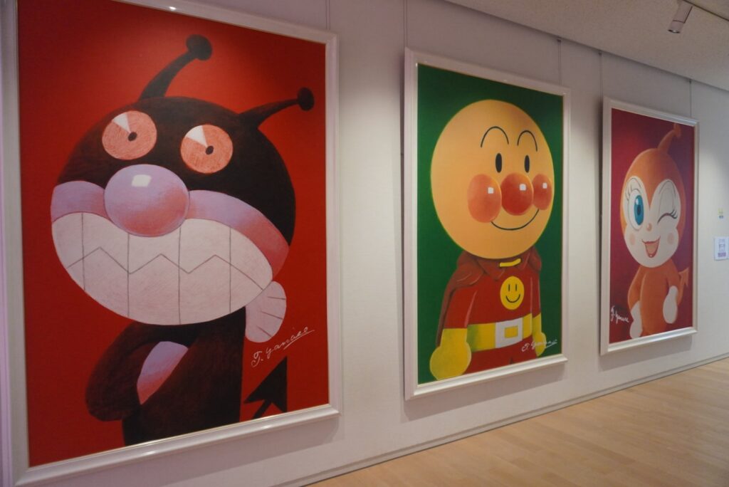 館内は天井に巨大なアンパンマンとアンパンマン号があり、原画や大きなイラストが展示されていて、子ども向けというより大人も楽しめる美術館的な雰囲気があった。
