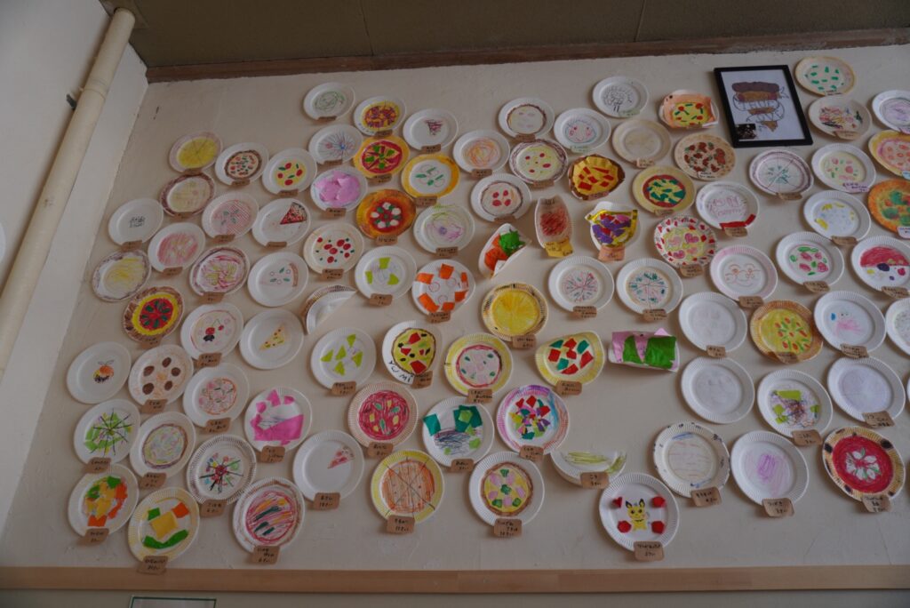 壁には、過去に来店したお客さんが描いたピザの絵がたくさん貼られていて、
