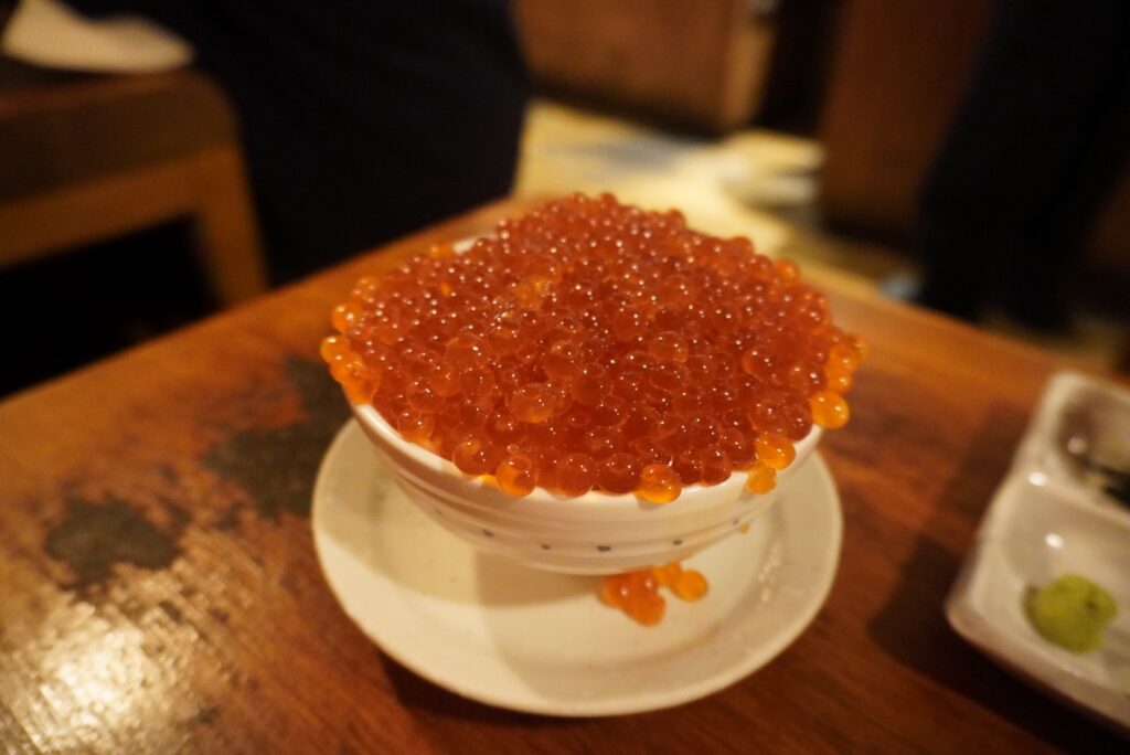 名物はなんといっても“つっこ飯”。白米の上に、こぼれ落ちるほどのいくらを豪快にかけてくれる名物メニュー。