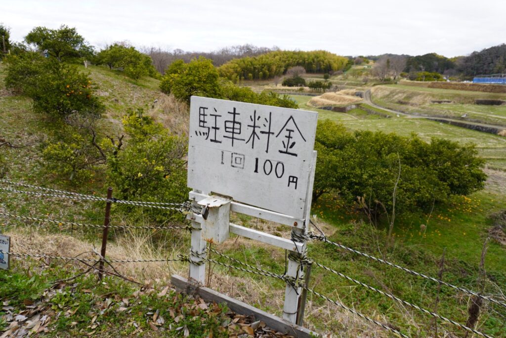 ホテルから車で向かうと、途中で「本当にここ通っていいの?」と思うような農道のような坂道を登っていきます。到着した駐車場は無人で、料金は100円を料金箱に入れるスタイル。私の車は大きめでしたが、それでも駐車可能です。