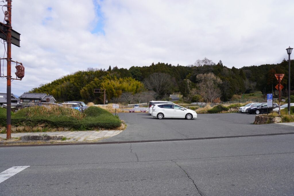 ここも細い農道のような道を登っていくと到着し、正面に無料駐車場があります(入場料は別途必要)。