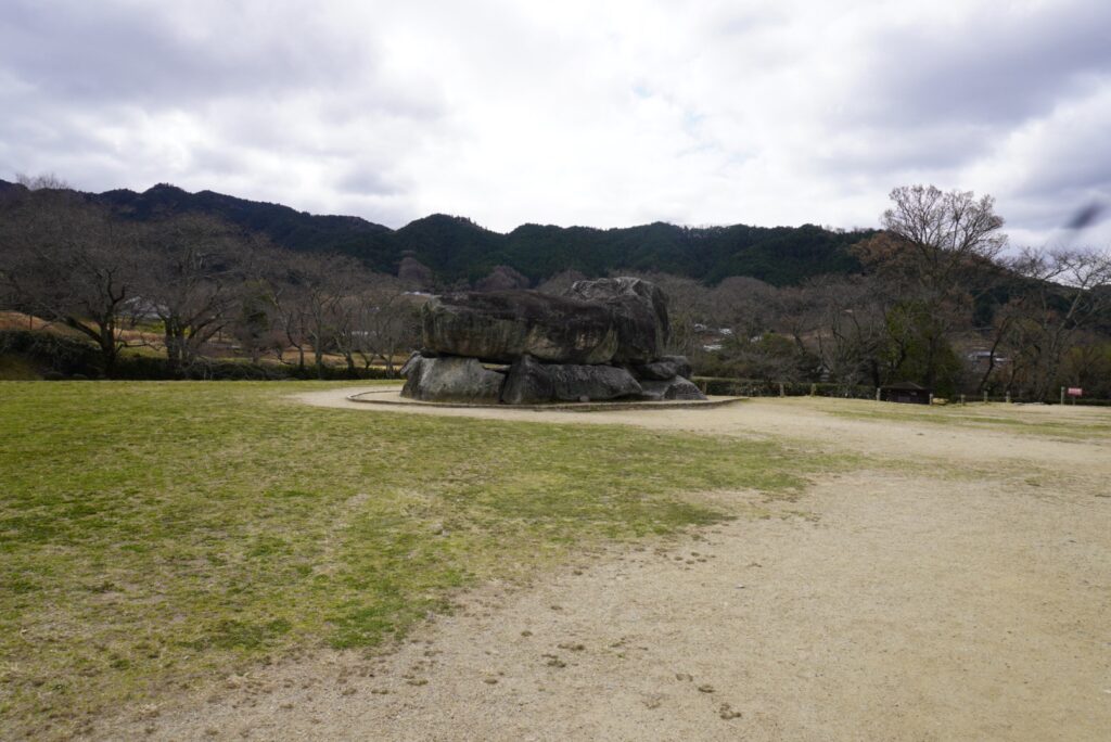 坂道を少し登ると石舞台古墳に到着。古墳時代後期の古墳で、現在は盛り土がなくなり、巨大な石を組み合わせた石室がむき出しになっています。埋葬者は不明ですが、蘇我馬子説が有力とされています。