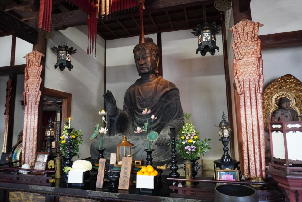 本堂には「飛鳥大仏」があり、写真撮影も可能。国宝ではないため撮影できるそうですが、火災などで損傷を受けながらも、顔の上半分と右手のひらの一部は当時のまま残っているとのこと。